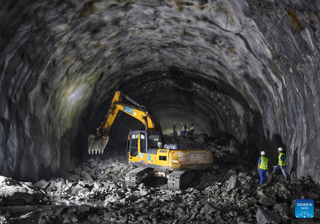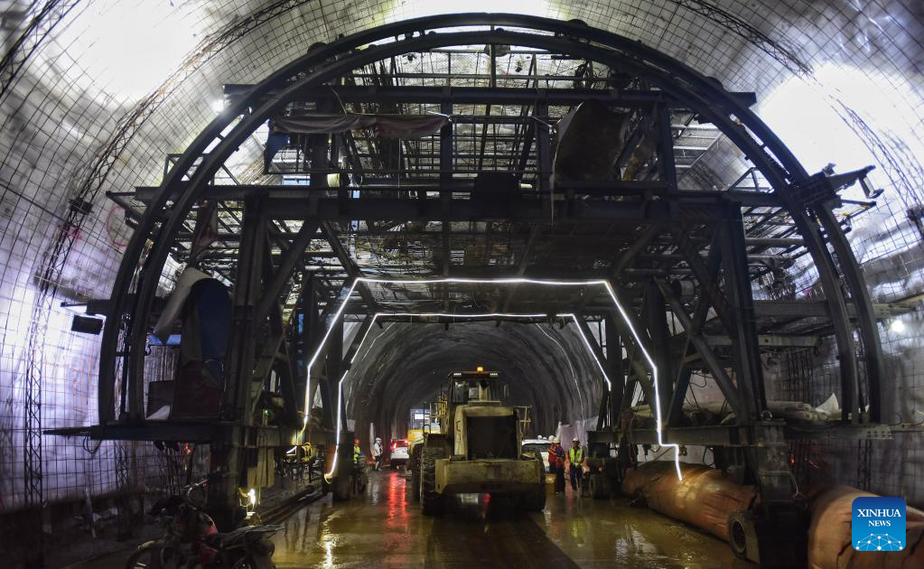 Workers are seen at the construction site of Futoushi Tunnel of Guangzhou-Shanwei Railway in Huidong County of Huizhou, south China's Guangdong Province, April 22, 2022. The Futoushi tunnel of Guangzhou-Shanwei Railway was drilled through on Friday. The 206.2km-long Guangzhou-Shanwei Railway with a maximum speed of 350 km per hour is expected to be put into operation in 2023. (Xinhua/Liu Dawei)