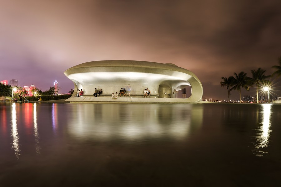 Photo taken on April 16, 2022 shows the Wormhole Library in the Haikou Bay in Haikou, south China's Hainan Province. (Xinhua/Zhang Liyun)
