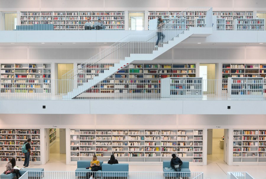People visit the City Library of Stuttgart in Stuttgart, Germany, on April 19, 2022. (Xinhua/Lu Yang)