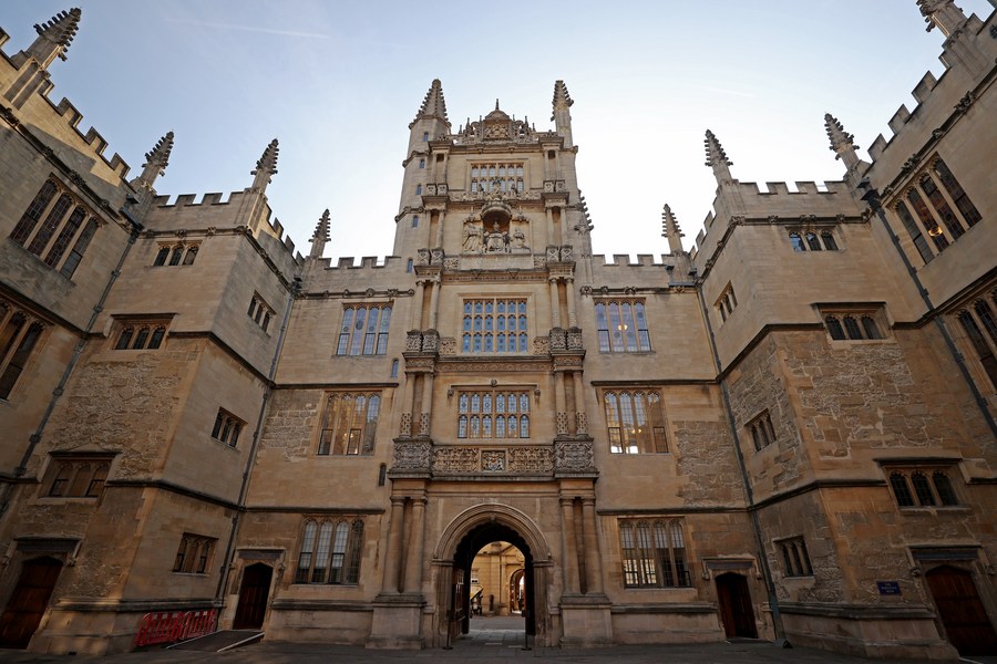 Photo taken on April 21, 2022 shows an exterior view of the Bodleian Libraries in the University of Oxford, Britain. As the library service supporting the University of Oxford, Bodleian Libraries include the principal University library, the Bodleian Library, which has been a library of legal deposit for 400 years, as well as 27 other libraries across Oxford including major research libraries and faculty, department and institute libraries.