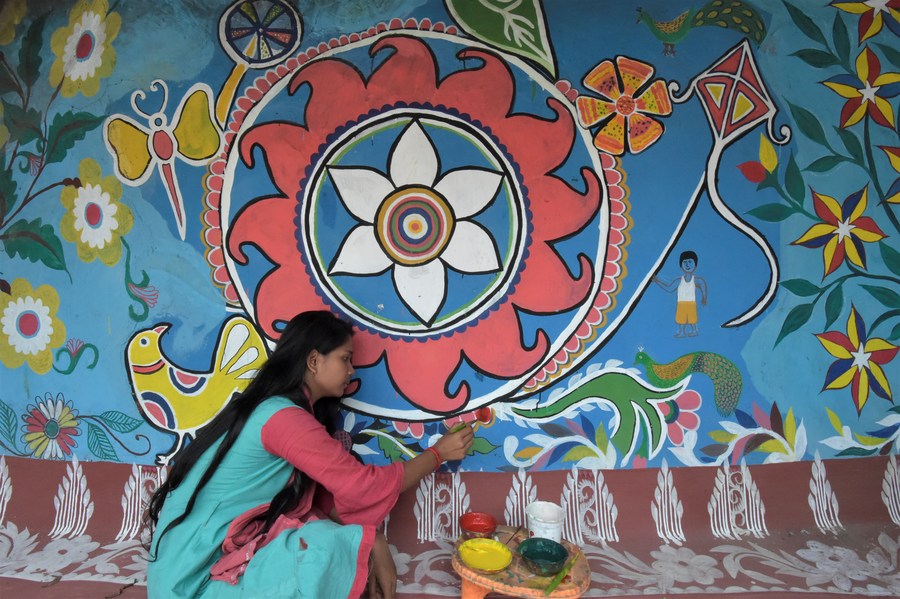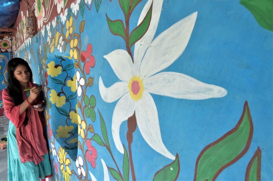 A girl paints the wall of her home in the "Alpona Gram" village in Chapainawabganj, Bangladesh on April 20, 2022. (Xinhua)