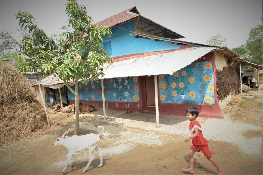 A child plays in front of a house with painted walls in the "Alpona Gram" village in Chapainawabganj, Bangladesh on April 20, 2022. (Xinhua)