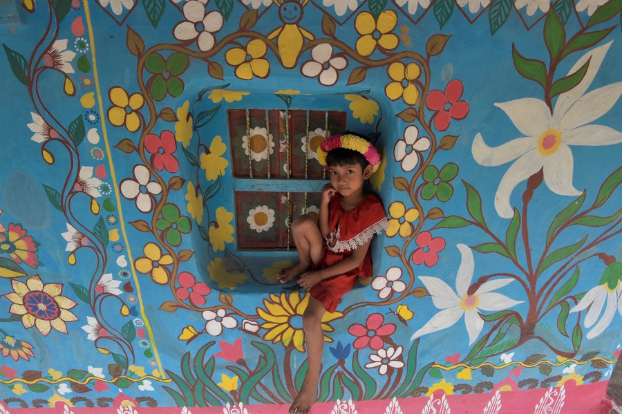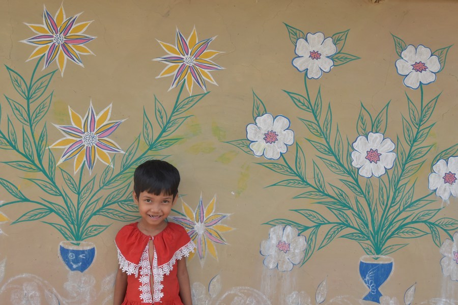 A child poses for a picture in front of a painted wall in the "Alpona Gram" village in Chapainawabganj, Bangladesh on April 20, 2022. (Xinhua)