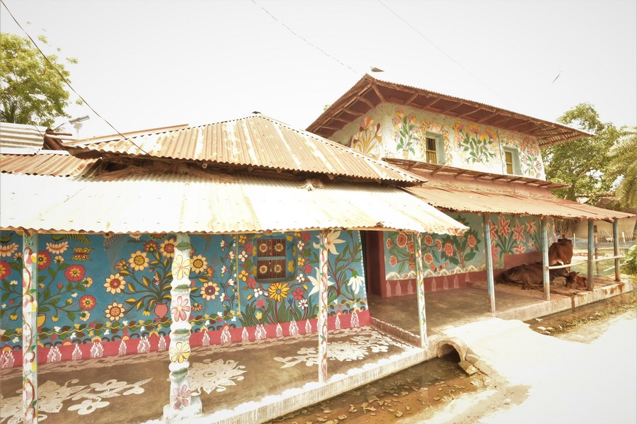 Photo taken on April 20, 2022 shows houses with painted walls in the "Alpona Gram" village in Chapainawabganj, Bangladesh. (Xinhua) ■