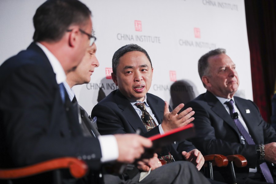 Ni Pin (2nd R), president of Wanxiang America Corporation, the Chicago-based arm of Wanxiang Group Company, speaks during a panel discussion at the China Institute 2018 Executive Summit, "U.S.-China Business in the New World Order," in New York, the United States, April 12, 2018. (Xinhua/Wang Ying)