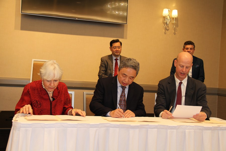 Before signing the agreement named after her and her husband for their contribution to a strong China-U.S. relationship, Sarah Lande stressed the importance of having more opportunities for people, young people in particular, from China and the United States to get together. "When the people get together, it seems like the barrier comes down," she said.