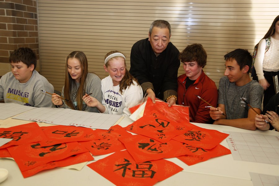 A Chinese master teaches students to write Chinese calligraphy during the 2016 Muscatine Chinese Culture Week at Muscatine High School in Iowa, the United States, Nov. 14, 2016. (Xinhua/Wang Ping)