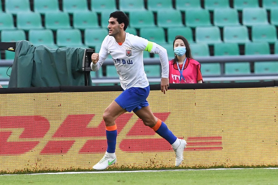 Marouane Fellaini of Shandong Taishan celebrates scoring against Shenzhen FC in the 2021 Chinese Super League (CSL) season in Guangzhou, Guangdong Province, May 14, 2021. (Xinhua)