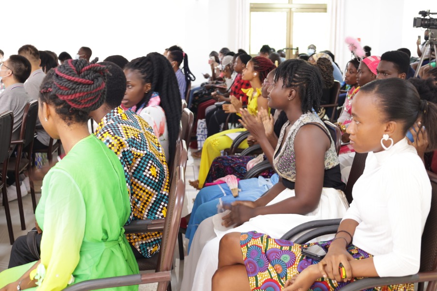 Audiences watch a Chinese speech and performance competition held by the Confucius Institute at the University of Ghana, in Accra, Ghana, on April 23, 2022. (Xinhua/Xu Zheng)