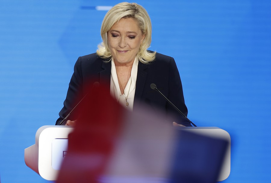 Marine Le Pen, candidate of the far-right National Rally party, attends a rally after the presidential runoff in Paris, France, on April 24, 2022. (Xinhua/Gao Jing)