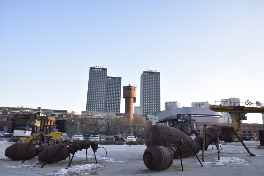 File photo taken on Dec. 26, 2021 shows ant-shaped sculptures at Westred Square in Harbin, northeast China's Heilongjiang Province. (Xinhua/Zhu Yue)