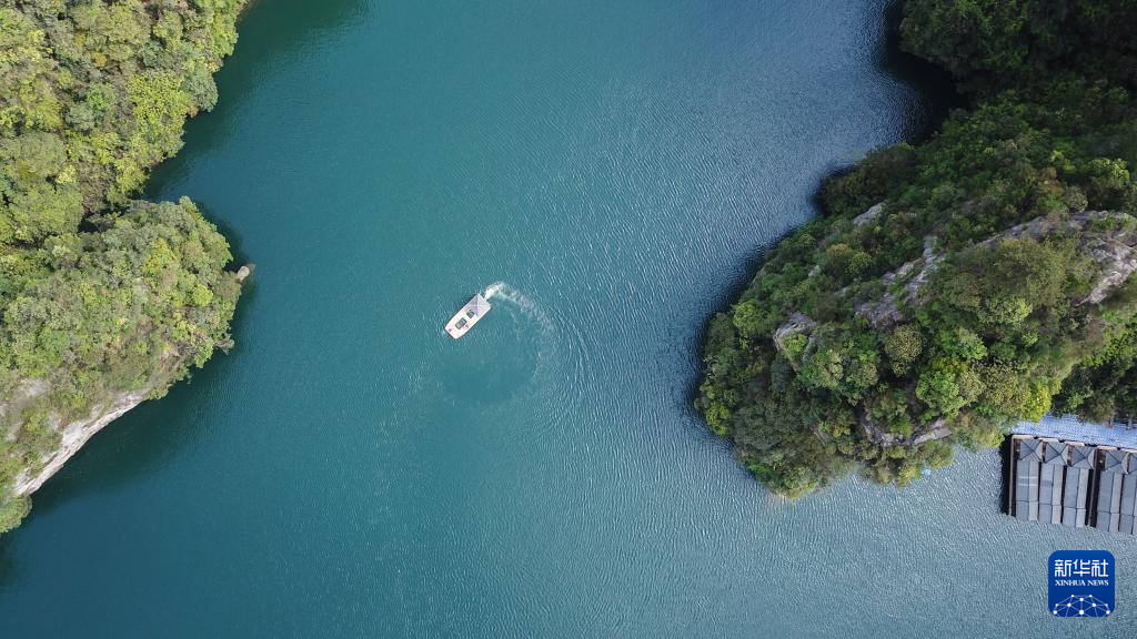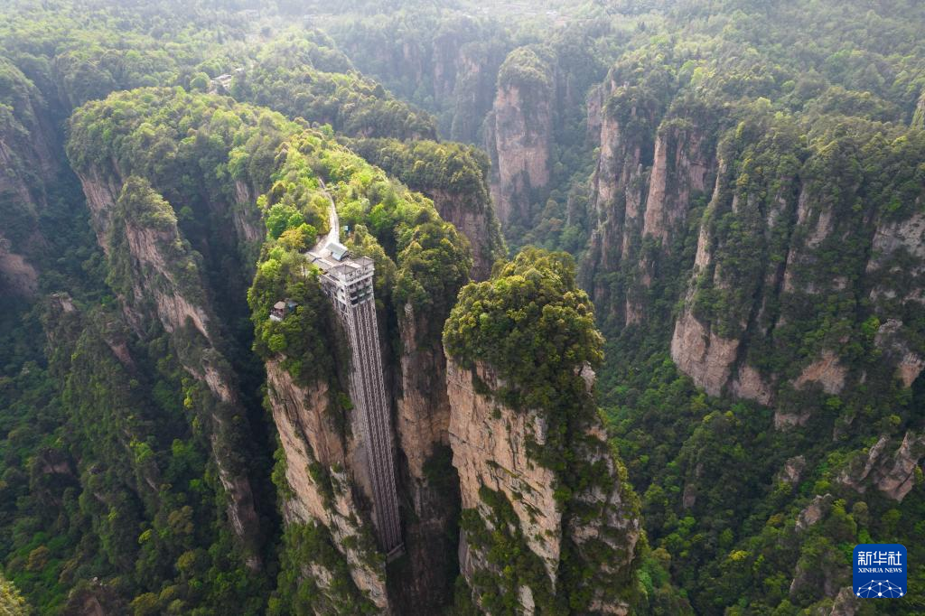 Aerial photo taken on April 19, 2022 shows the Bailong Elevator built onto the side of a huge cliff at the Wulingyuan scenic area in Zhangjiajie, central China's Hunan Province. Wulingyuan, a UNESCO World Heritage Site, is noted for its unique quartzite sandstone pillars and peaks across most of the site. (Xinhua/Chen Sihan)