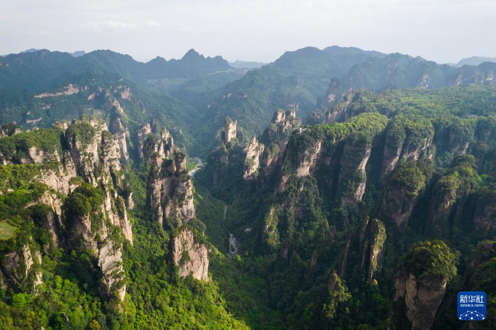 Aerial photo taken on April 19, 2022 shows a view of the Wulingyuan scenic area in Zhangjiajie, central China's Hunan Province. Wulingyuan, a UNESCO World Heritage Site, is noted for its unique quartzite sandstone pillars and peaks across most of the site. (Xinhua/Chen Sihan)