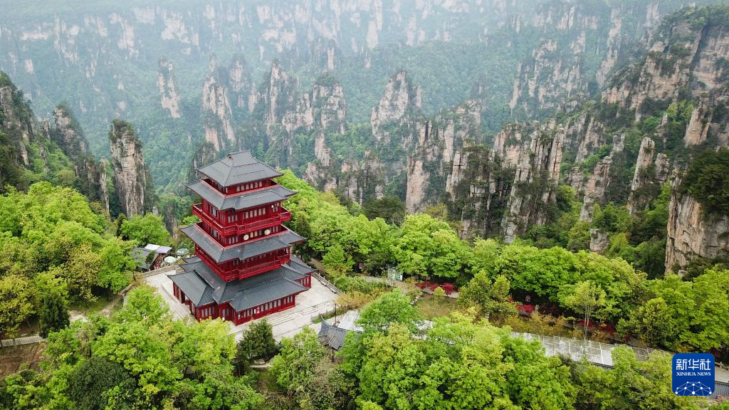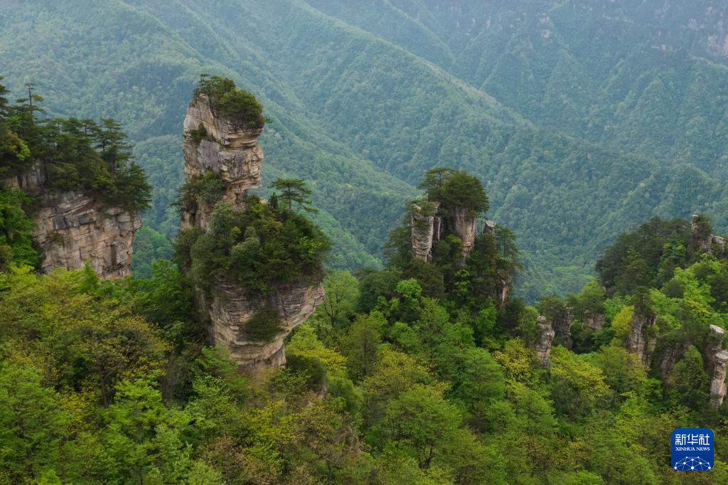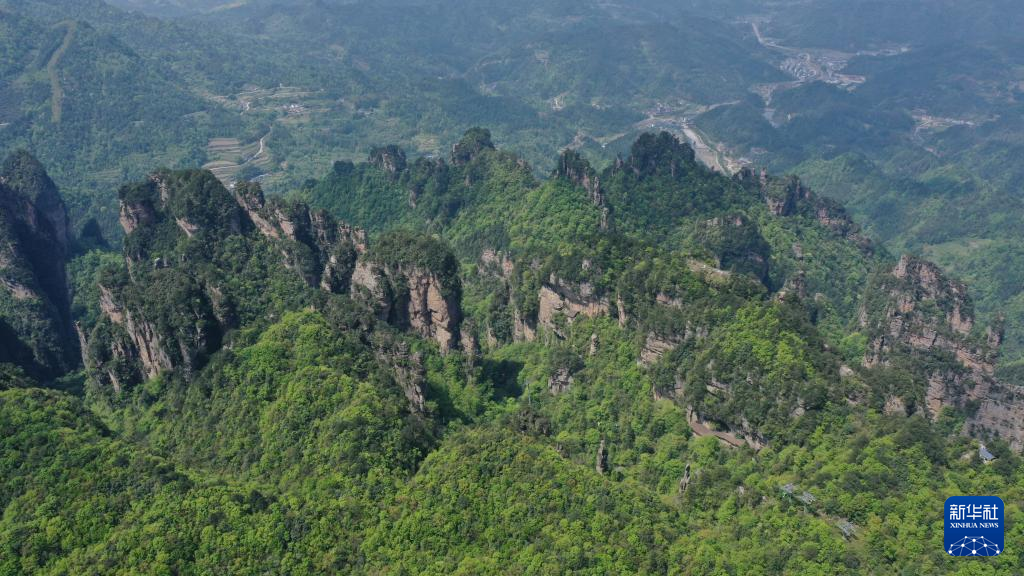 Aerial photo taken on April 20, 2022 shows a view of the Wulingyuan scenic area in Zhangjiajie, central China's Hunan Province. Wulingyuan, a UNESCO World Heritage Site, is noted for its unique quartzite sandstone pillars and peaks across most of the site. (Xinhua/Zhao Zhongzhi)