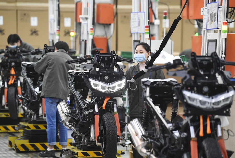 Staff work at the motorcycle engine workshop of the Loncin Motor Co., Ltd. in the Chongqing Hi-tech Zone, southwest China's Chongqing Municipality, March 3, 2020. (Xinhua/Wang Quanchao)