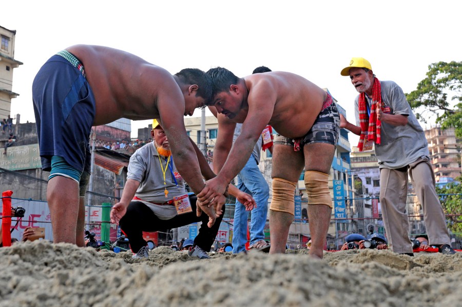 Wrestlers compete in the 113th "Boli Khela", a traditional wrestling competition in Chattogram, Bangladesh on April 25, 2022. (Xinhua)