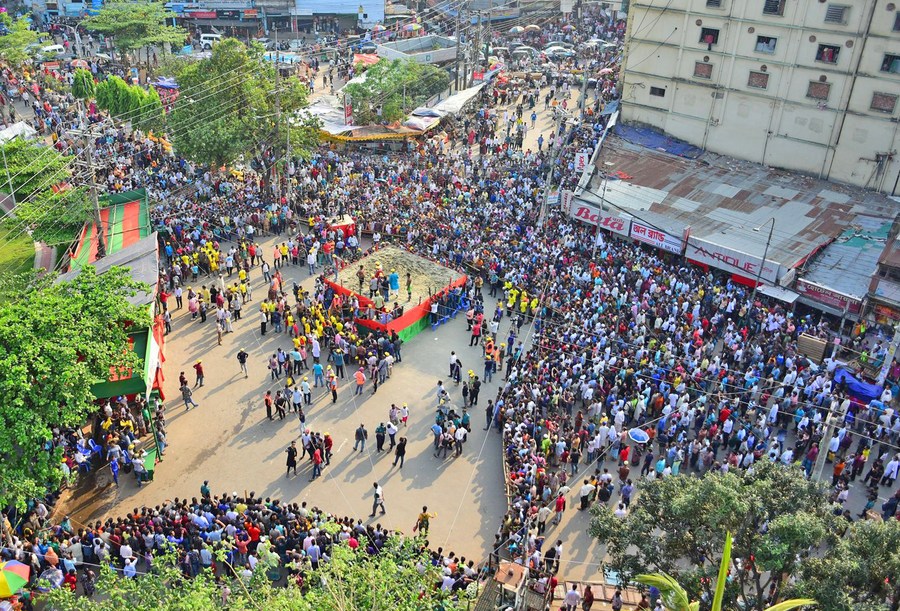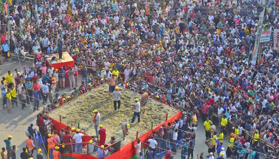 People watch wrestlers competing in the 113th "Boli Khela", a traditional wrestling competition in Chattogram, Bangladesh on April 25, 2022. (Xinhua)