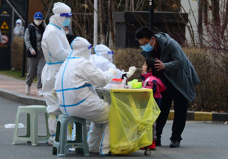 A medical worker takes a swab sample from a child for nucleic acid test at a COVID-19 testing site in Changchun, northeast China's Jilin Province, April 14, 2022. (Xinhua/Zhang Jian)
