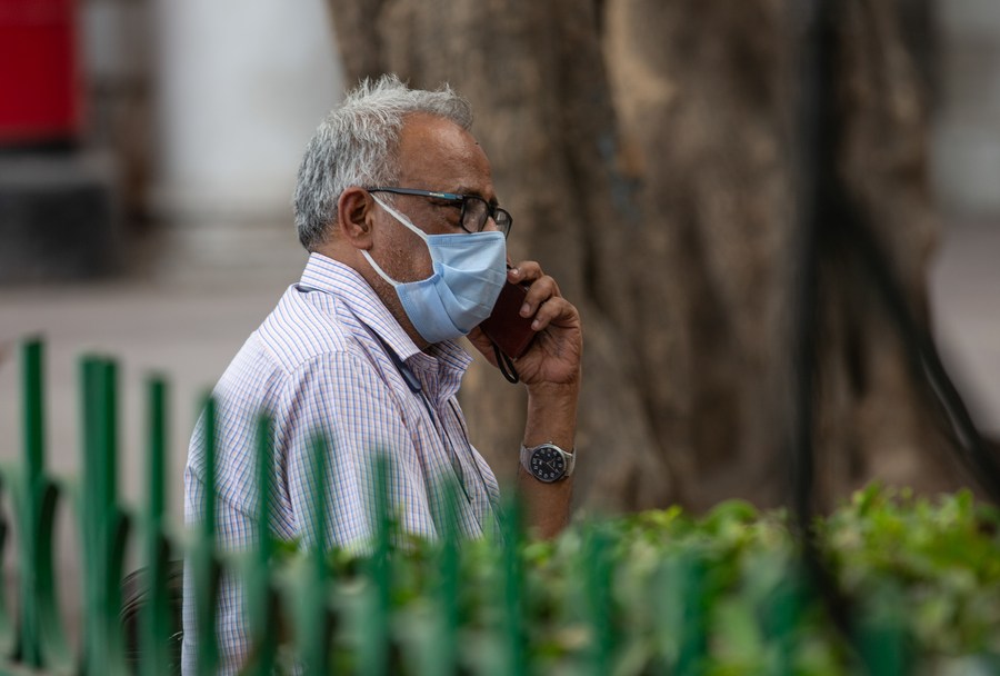 A man wearing a face mask talks on his phone at a marketplace in New Delhi, India, April 22, 2022. (Xinhua/Javed Dar)