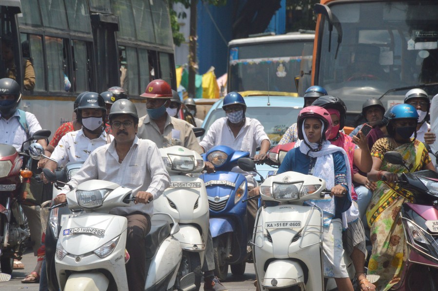 People ride on the road in Bangalore, India, April 26, 2022. (Str/Xinhua)
