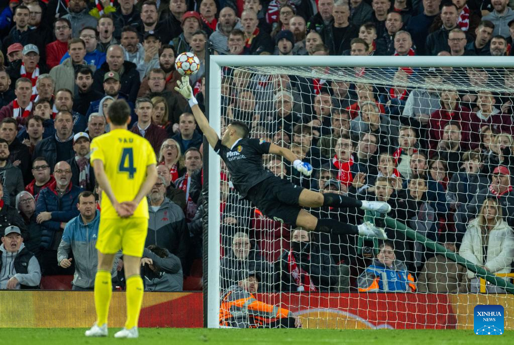 Villarreal's goalkeeper Geronimo Rulli (R) tries to save the ball before the ball hits the post during the UEFA Champions League semifinal 1st Leg match between Liverpool and Villarreal in Liverpool, Britain, on April 27, 2022.(Xinhua)