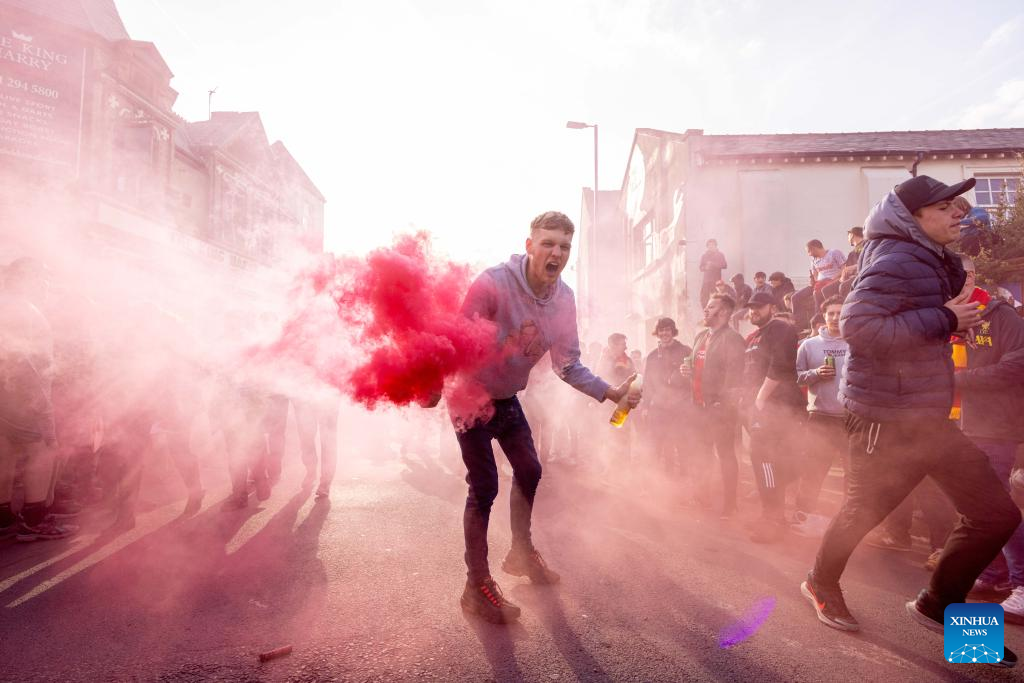 Liverpool supporter with a smoke bomb welcomes the team coach before the UEFA Champions League semifinal 1st Leg match between Liverpool and Villarreal in Liverpool, Britain, on April 27, 2022.(Xinhua)