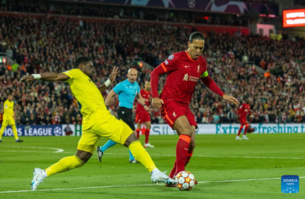 Liverpool's Virgil van Dijk (R) is challenged by Villarreal's Serge Aurier during the UEFA Champions League semifinal 1st Leg match between Liverpool and Villarreal in Liverpool, Britain, on April 27, 2022.(Xinhua)