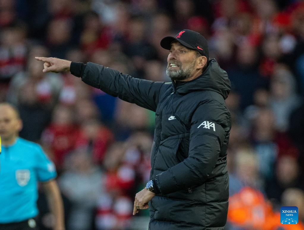 Liverpool's manager Jurgen Klopp gestures during the UEFA Champions League semifinal 1st Leg match between Liverpool and Villarreal in Liverpool, Britain, on April 27, 2022.(Xinhua)