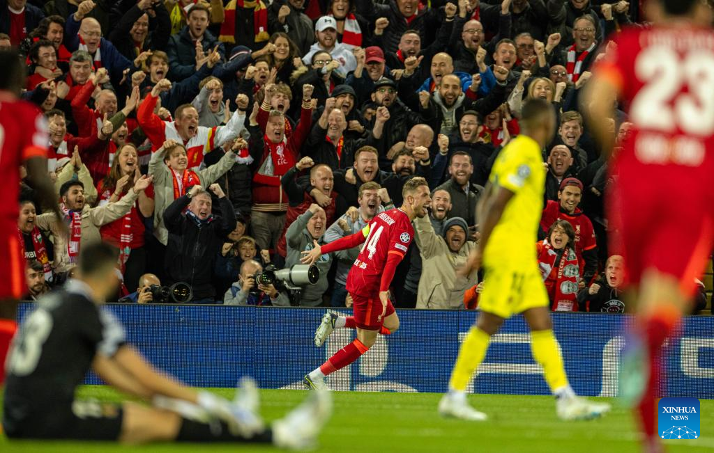 Liverpool's Jordan Henderson (Rear) celebrates the opening goal during the UEFA Champions League semifinal 1st Leg match between Liverpool and Villarreal in Liverpool, Britain, on April 27, 2022.(Xinhua)