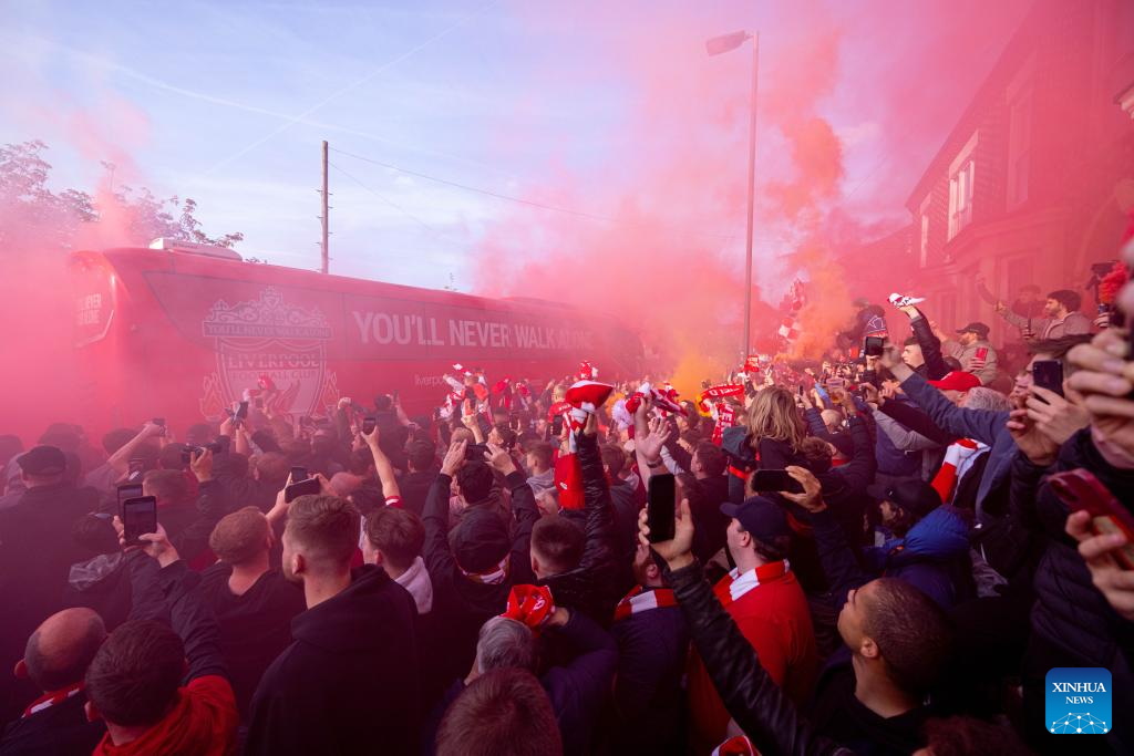 Liverpool supporters welcome the team coach before the UEFA Champions League semifinal 1st Leg match between Liverpool and Villarreal in Liverpool, Britain, on April 27, 2022.(Xinhua)