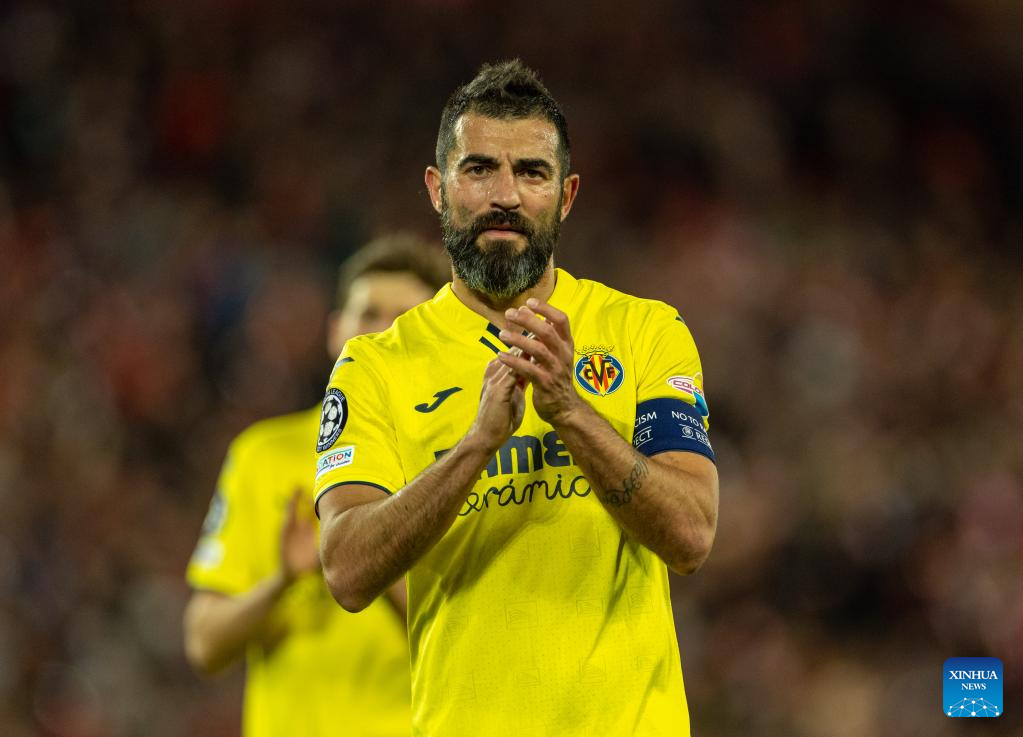 Villarreal's captain Raul Albiol applauds the supporters after the UEFA Champions League semifinal 1st Leg match between Liverpool and Villarreal in Liverpool, Britain, on April 27, 2022.(Xinhua)