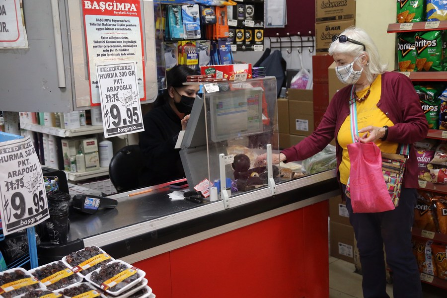 A customer pays with a credit card in a grocery market in Ankara, capital of Turkey, on April 27, 2022. (Photo by Mustafa Kaya/Xinhua)