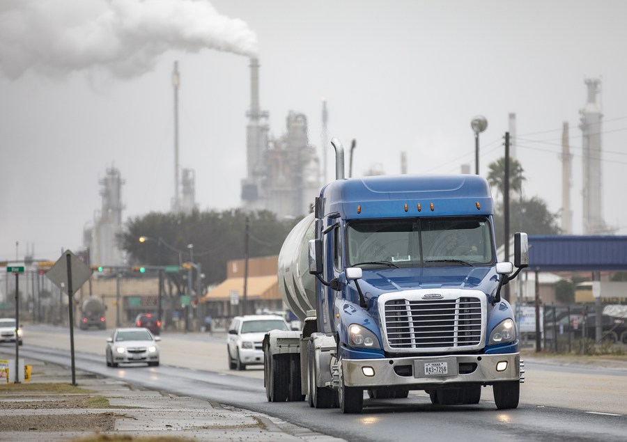 An oil truck drives along a highway after delivering oil to an oil refinery plant in Three Rivers, Texas, the United States on Feb. 24, 2022. (Photo by Nick Wagner/Xinhua)