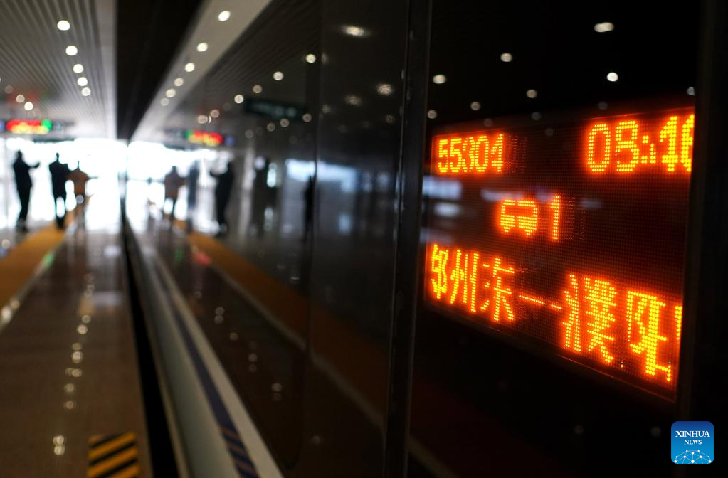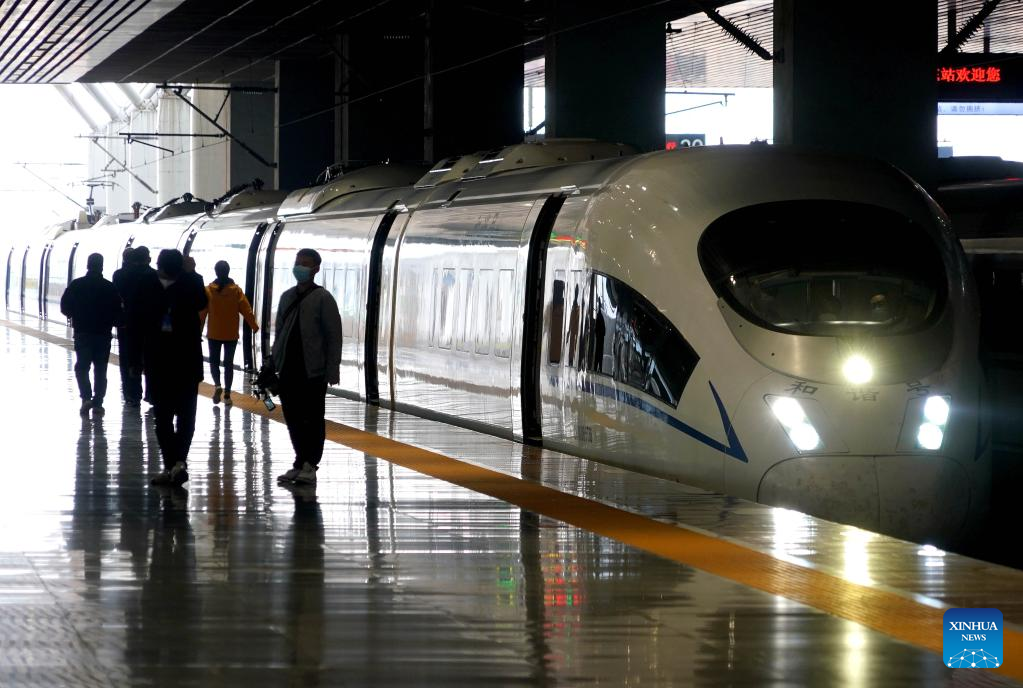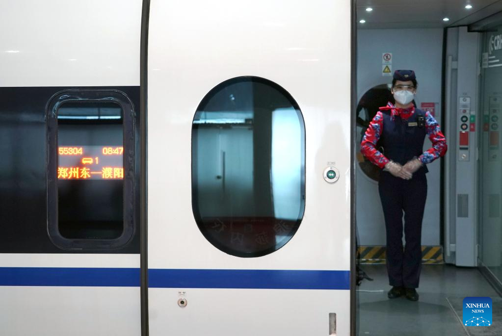 A test bullet train is seen before departure at Zhengzhou East Railway Station in Zhengzhou, central China's Henan Province, April 29, 2022. The Zhengzhou-Puyang section of the Zhengzhou-Jinan high-speed railway started trial run on Friday. (Xinhua/Li An)
