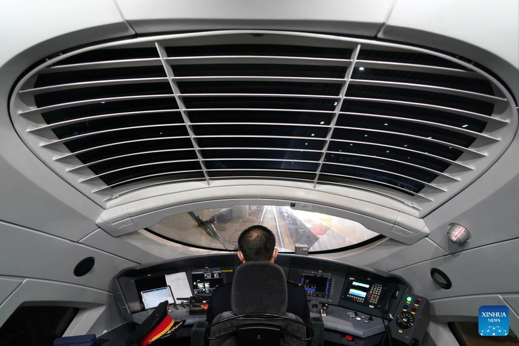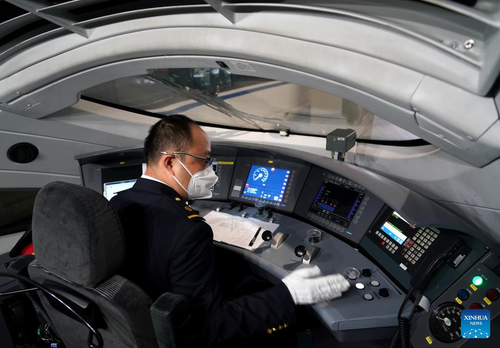 The driver of a test bullet train makes preparation before departure at Zhengzhou East Railway Station in Zhengzhou, central China's Henan Province, April 29, 2022. The Zhengzhou-Puyang section of the Zhengzhou-Jinan high-speed railway started trial run on Friday. (Xinhua/Li An)
