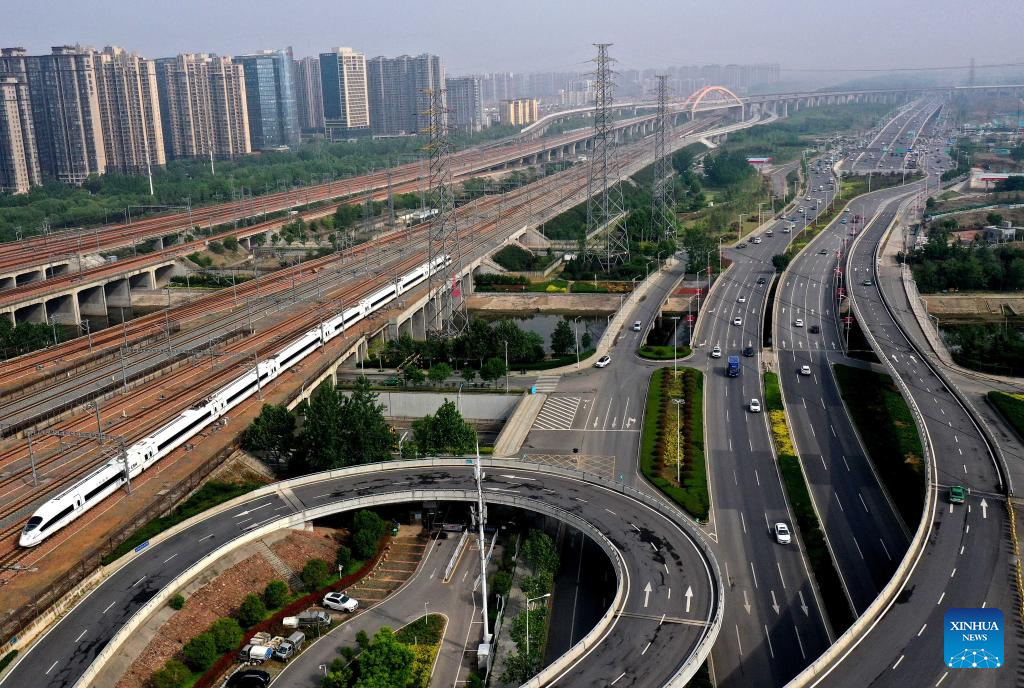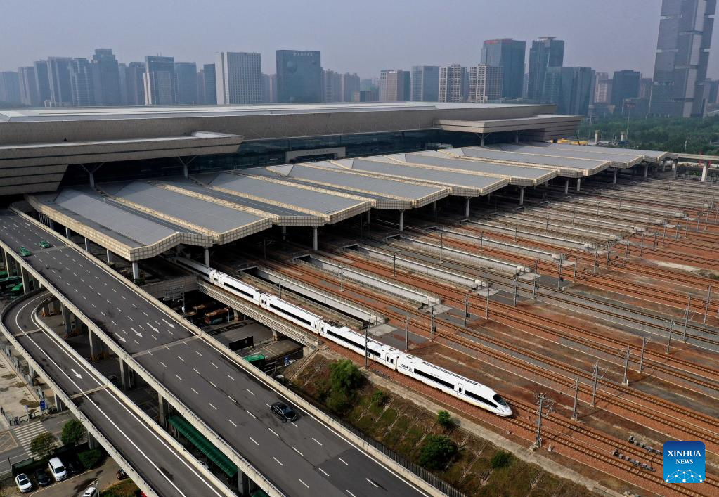 Aerial photo taken on April 29, 2022 shows a bullet train departing from Zhengzhou East Railway Station during a trial run in Zhengzhou, central China's Henan Province. The Zhengzhou-Puyang section of the Zhengzhou-Jinan high-speed railway started trial run on Friday. (Xinhua/Li An)