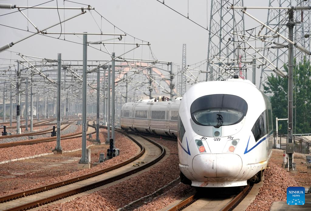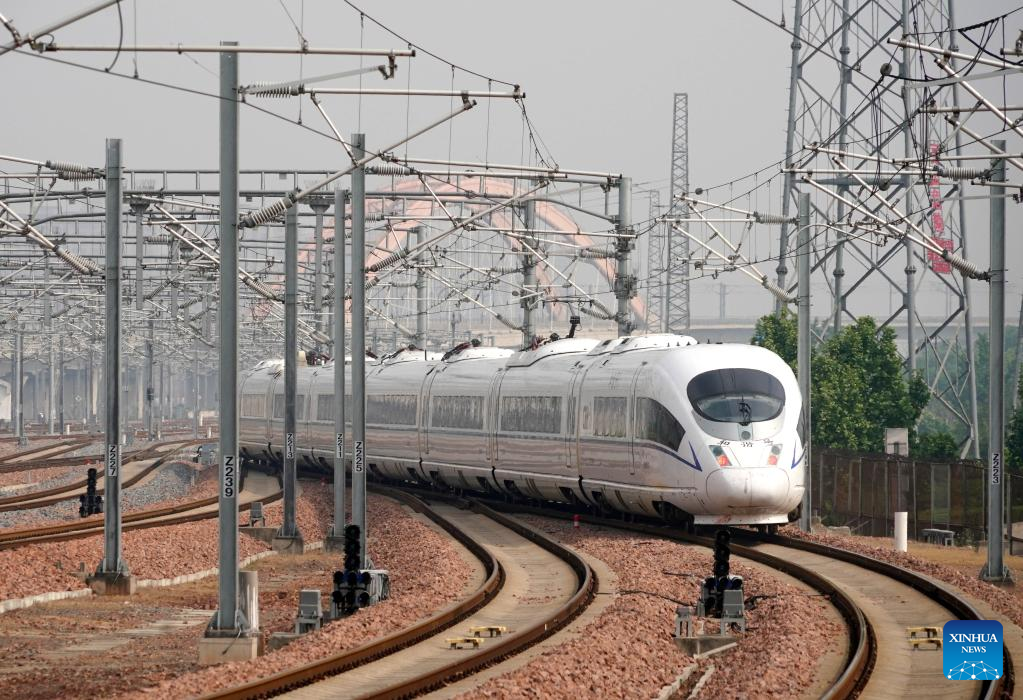 A bullet train departs from Zhengzhou East Railway Station during a trial run in Zhengzhou, central China's Henan Province, April 29, 2022. The Zhengzhou-Puyang section of the Zhengzhou-Jinan high-speed railway started trial run on Friday. (Xinhua/Li An)