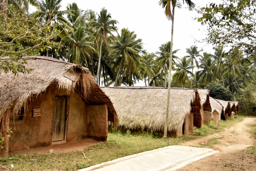 Photo taken on Feb. 23, 2022 shows boat-shaped thatch houses in Baicha Village of Dongfang City, south China's Hainan Province. (Xinhua/Liu Deng)