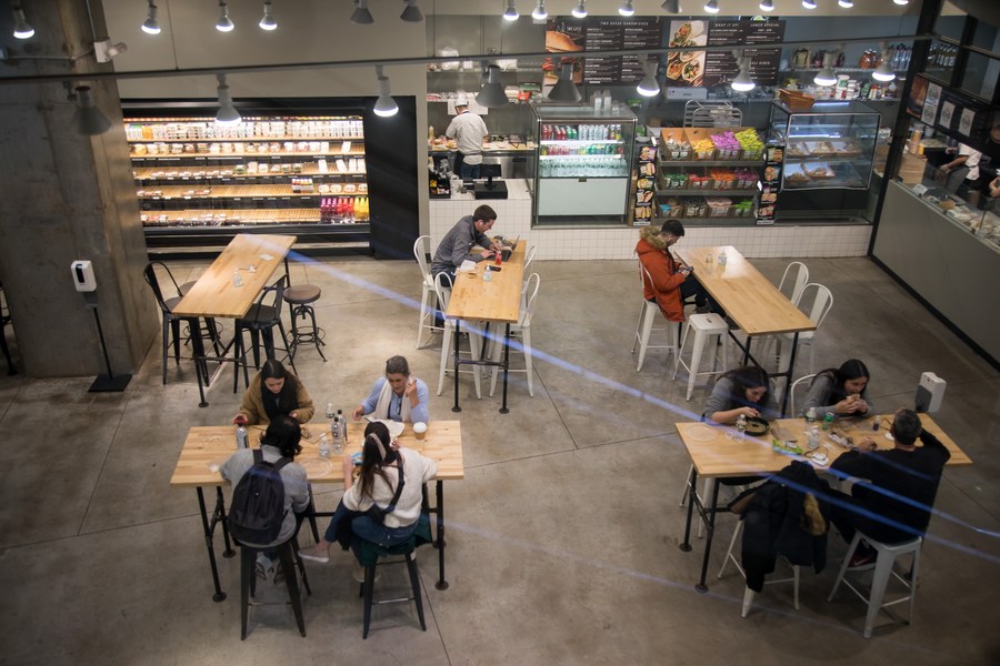 People eat at the Westfield shopping mall at the Oculus in New York, the United States, on March 10, 2022. (Photo by Michael Nagle/Xinhua)
