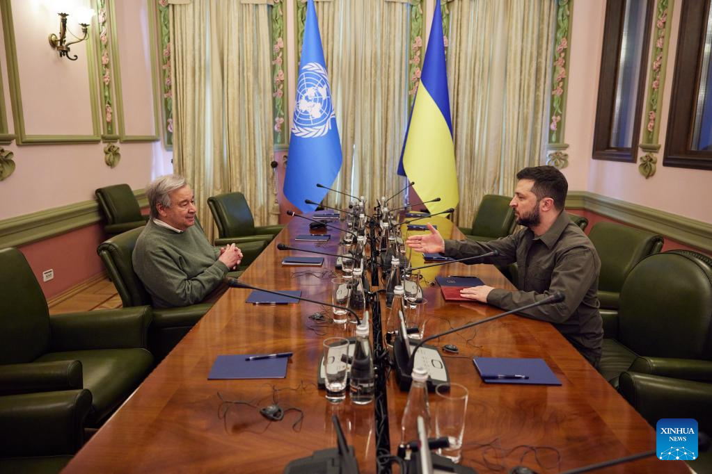 KIEV, April 28 (Xinhua) -- Ukrainian President Volodymyr Zelensky and United Nations Secretary-General Antonio Guterres on Thursday discussed the evacuation of people from the besieged city of Mariupol, the presidential press service reported.