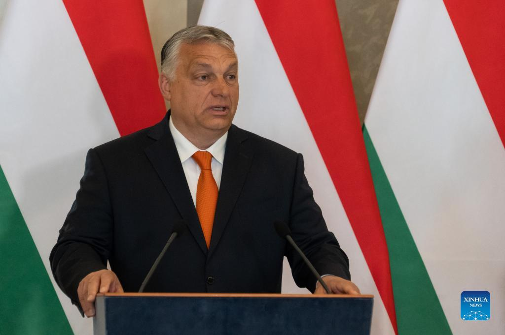 Hungarian Prime Minister Viktor Orban speaks to the media at a press conference in Budapest, Hungary, April 29, 2022. Hungarian President Janos Ader has asked Viktor Orban, the prime ministerial candidate of the Fidesz-KDNP coalition that won the parliamentary election on April 3, to form a new government. Orban accepted Ader's invitation here on Friday morning. Ader and Orban made a short joint press declaration after their meeting in the Sandor Palace. (Photo by Attila Volgyi/Xinhua)