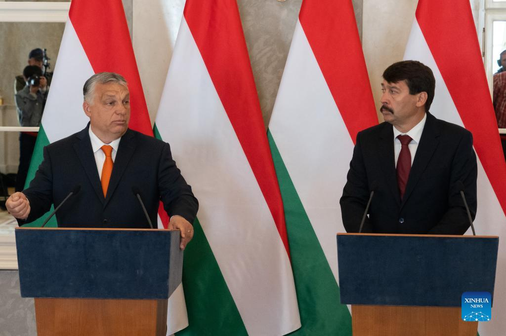 Hungarian President Janos Ader (R) and Prime Minister Viktor Orban speak to the media at a press conference in Budapest, Hungary, April 29, 2022. Hungarian President Janos Ader has asked Viktor Orban, the prime ministerial candidate of the Fidesz-KDNP coalition that won the parliamentary election on April 3, to form a new government. Orban accepted Ader's invitation here on Friday morning. Ader and Orban made a short joint press declaration after their meeting in the Sandor Palace. (Photo by Attila Volgyi/Xinhua)
