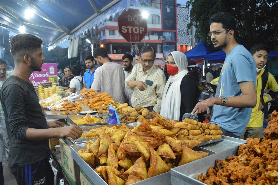 People purchase delicacies after breaking the fast on a food street during the holy fasting month of Ramadan, in Bangalore, India, April 15, 2022. (Str/Xinhua)