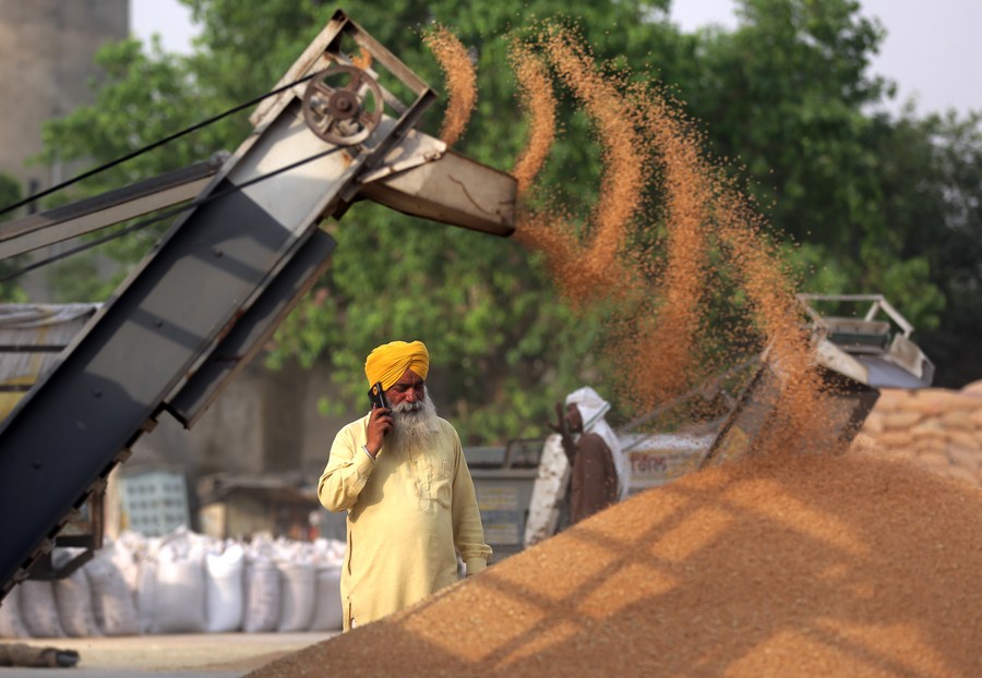 Wheat is unloaded from a trolley at a market in Amritsar district of India's northern Punjab state, April 19, 2022. (Str/Xinhua)