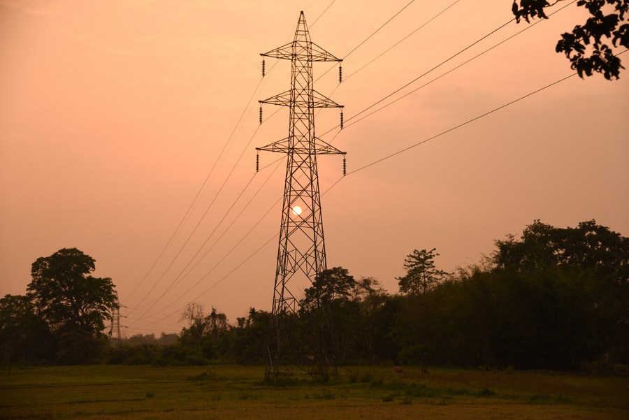 Photo taken on April 22, 2022 shows an electricity tower in Nagaon district of India's northeastern state of Assam. (Str/Xinhua)