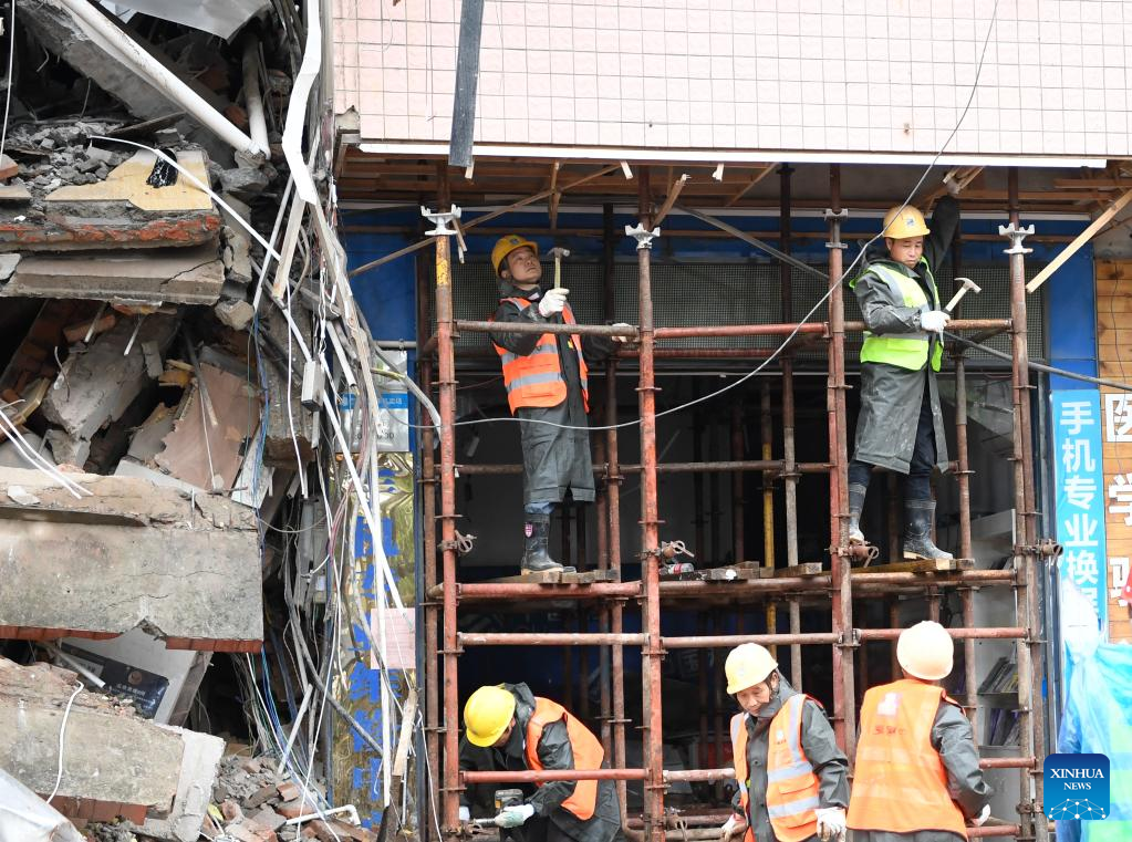 Rescuers reenforce a building next to the collapsed self-constructed residential building in Changsha, central China's Hunan Province, April 30, 2022.