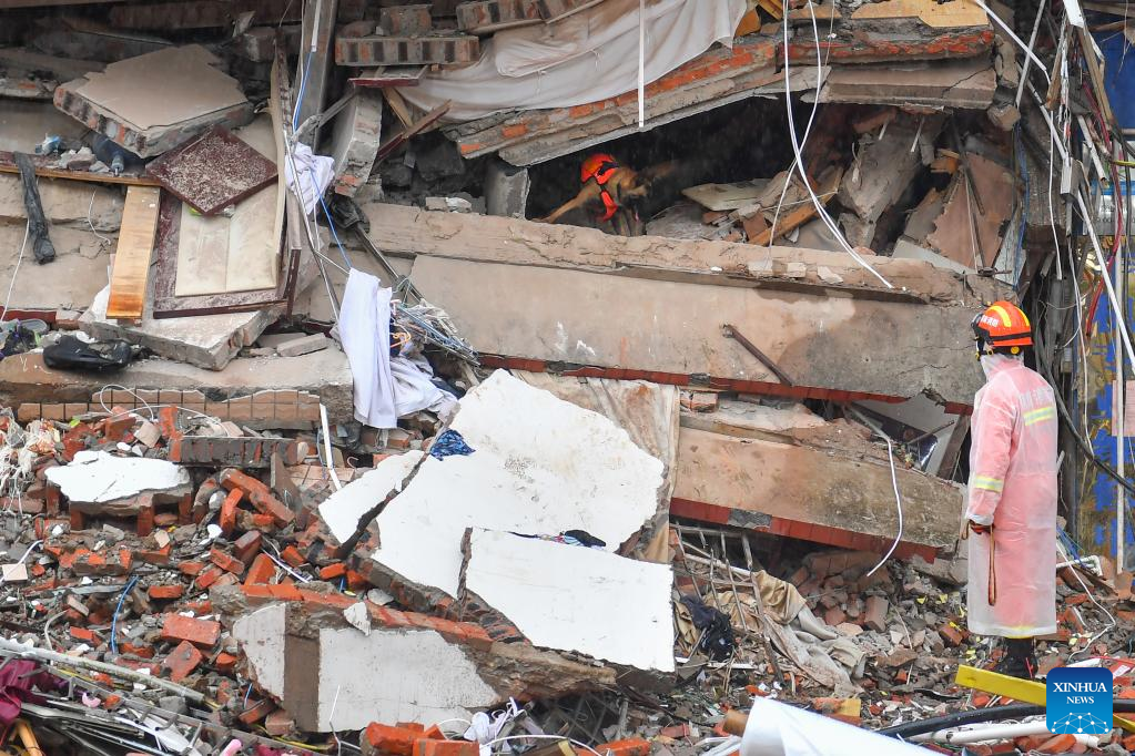 Staff members work at the collapse site of a self-constructed residential building in Changsha, central China's Hunan Province, April 30, 2022.
