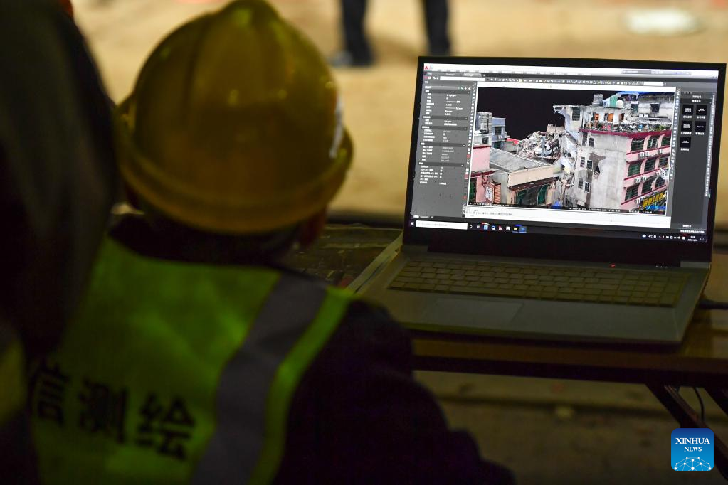 A rescuer uses surveying and mapping equipment to monitor the collapse site of a self-constructed residential building in Changsha, central China's Hunan Province, April 30, 2022.