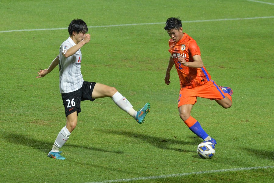 Zhang Yingkai (R) of Shandong Taishan FC takes on Kihara Rei of Urawa Red Diamonds during their 2022 AFC Champions League Group F match in Buriram, Thailand, April 30, 2022. (Xinhua/Rachen Sageamsak)