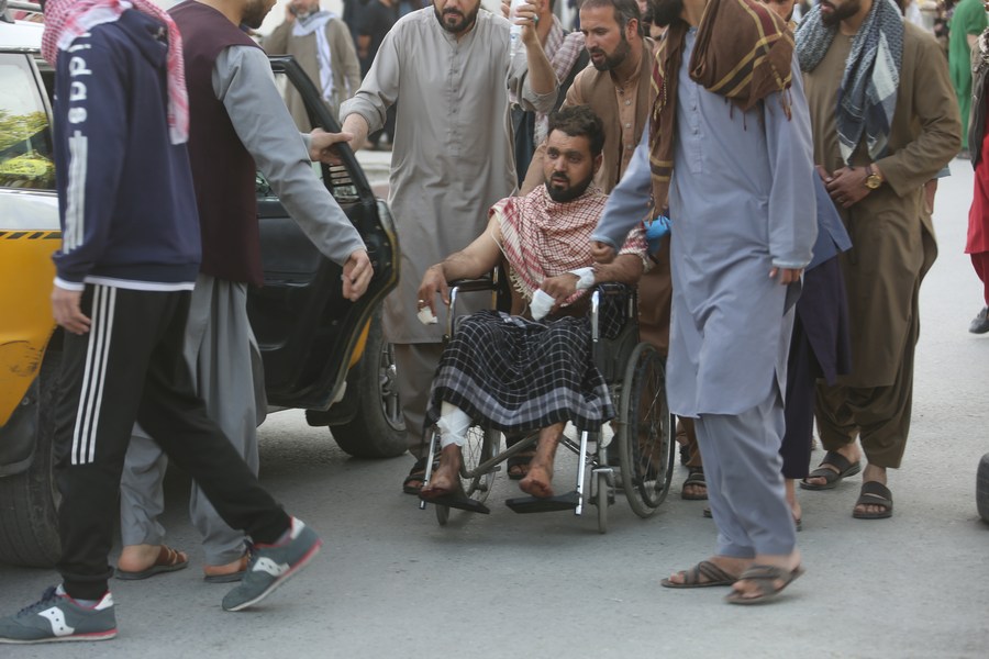 People send an injured man to a local hospital after a blast in Kabul, capital of Afghanistan, on April 29, 2022. (Photo by Saifurahman safi/Xinhua)